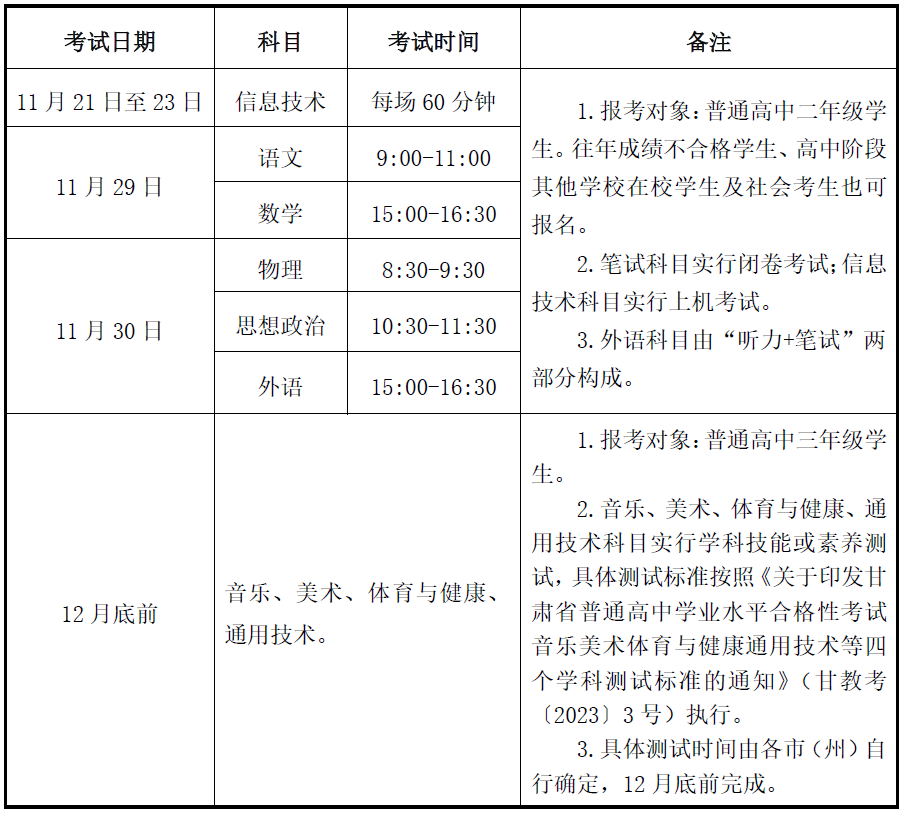 附件:2025年冬季甘肃省普通高中学业水平合格性考试科目及时间安排