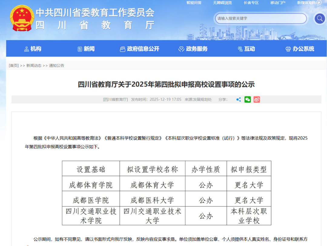 12月19日,四川省教育厅发布《关于2025年第四批拟申报高校设置事项的公示》。