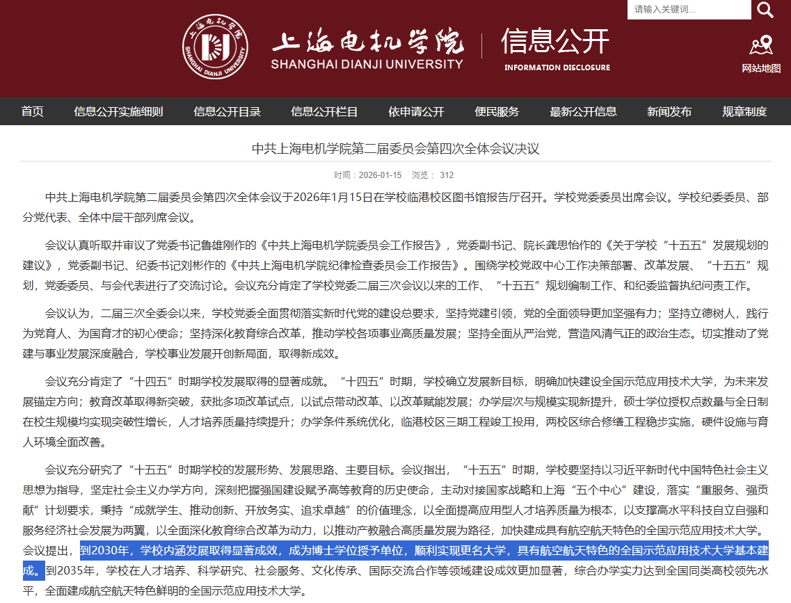1月15日,上海电机学院召开中共上海电机学院第二届委员会第四次全体会议。会议充分研究了“十五五”时期学校的发展形势、发展思路、主要目标,并提出,到2030年,学校内涵发展取得显著成效,成为博士学位授予单位,顺利实现更名大学,具有航空航天特色的全国示范应用技术大学基本建成。到2035年,学校在人才培养、科学研究、社会服务、文化传承、国际交流合作等领域建设成效更加显著,综合办学实力达到全国同类高校领先水平,全面建成航空航天特色鲜明的全国示范应用技术大学。