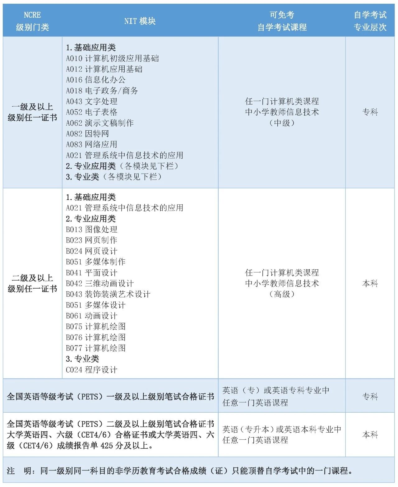 国家级非学历教育考试项目合格证免考自学考试课程对照表