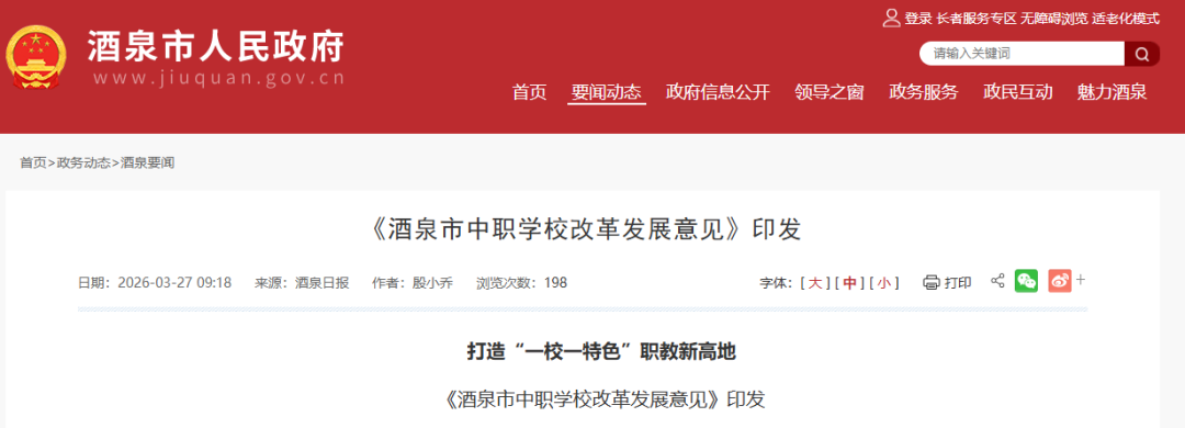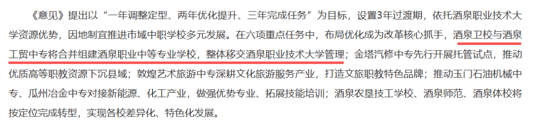 2026年3月,《酒泉市中职学校改革发展意见》印发,《意见》提出以“一年调整定型、两年优化提升、三年完成任务”为目标,设置3年过渡期,依托酒泉职业技术大学资源优势,因地制宜推进市域中职学校多元发展。在六项重点任务中,布局优化成为改革核心抓手,酒泉卫校与酒泉工贸中专将合并组建酒泉职业中等专业学校,整体移交酒泉职业技术大学管理