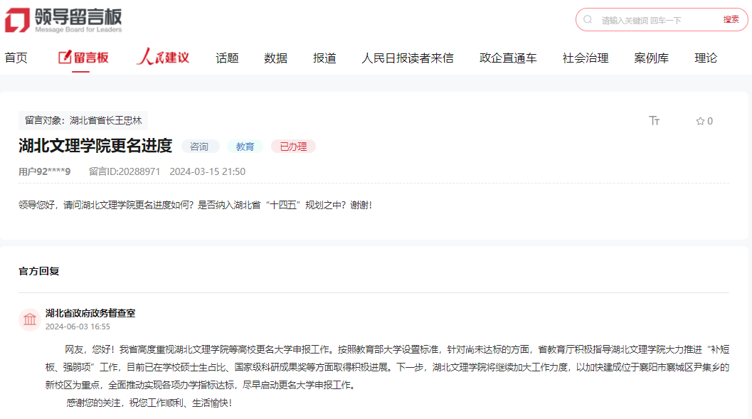2024年3月,有网友通过人民网领导留言板咨询“湖北文理学院更名大学的进展”,湖北省政府政务督查室回复表示:“目前已在学校硕士生占比、国家级科研成果奖等方面取得积极进展。下一步,湖北文理学院将继续加大工作力度,以加快建成位于襄阳市襄城区尹集乡的新校区为重点,全面推动实现各项办学指标达标,尽早启动更名大学申报工作。”