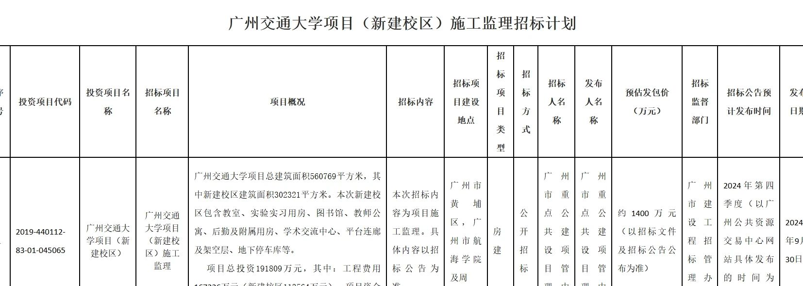 据招标计划显示,广州交通大学项目总建筑面积560769平方米,其中新建校区建筑面积302321平方米。项目总投资191809万元,其中:工程费用167226万元(新建校区113564万元)。项目资金来源为市本级基本建设统筹资金。
