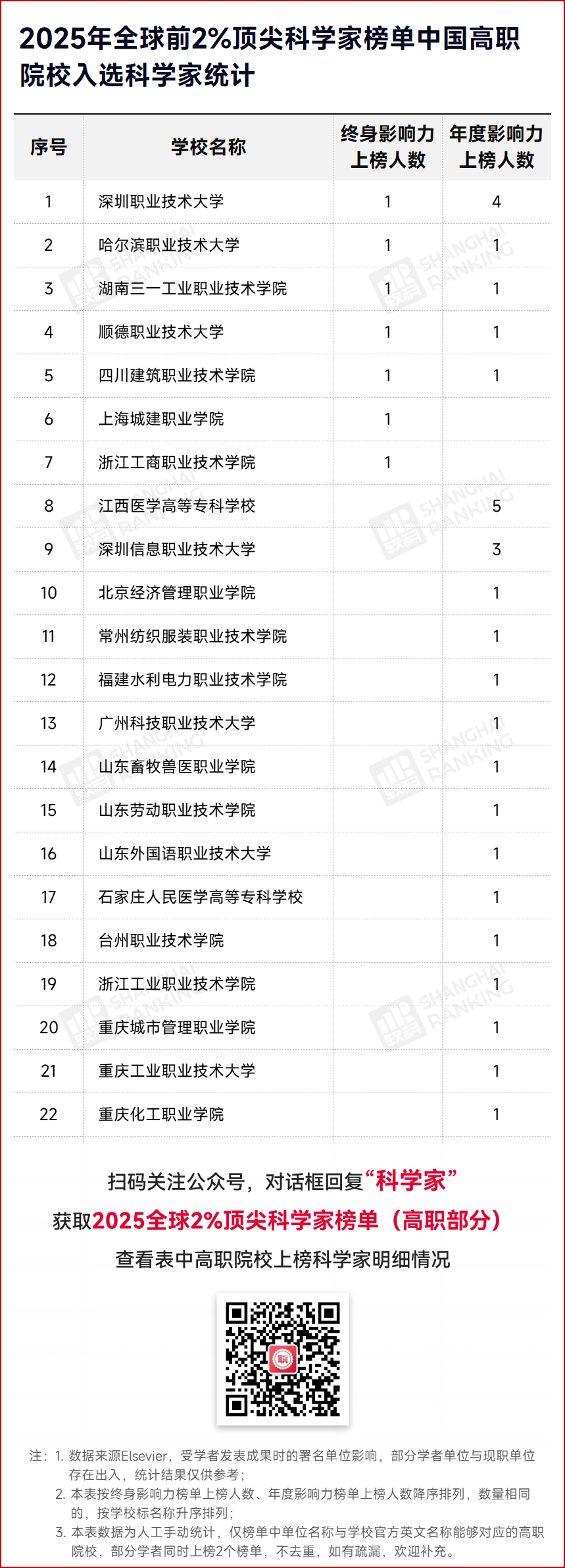 据【软科职教】统计,中国共有12374位学者进入“终身科学影响力排行榜”,有31685位学者入选“年度科学影响力排行榜”。其中,有22所高职院校的学者上榜。