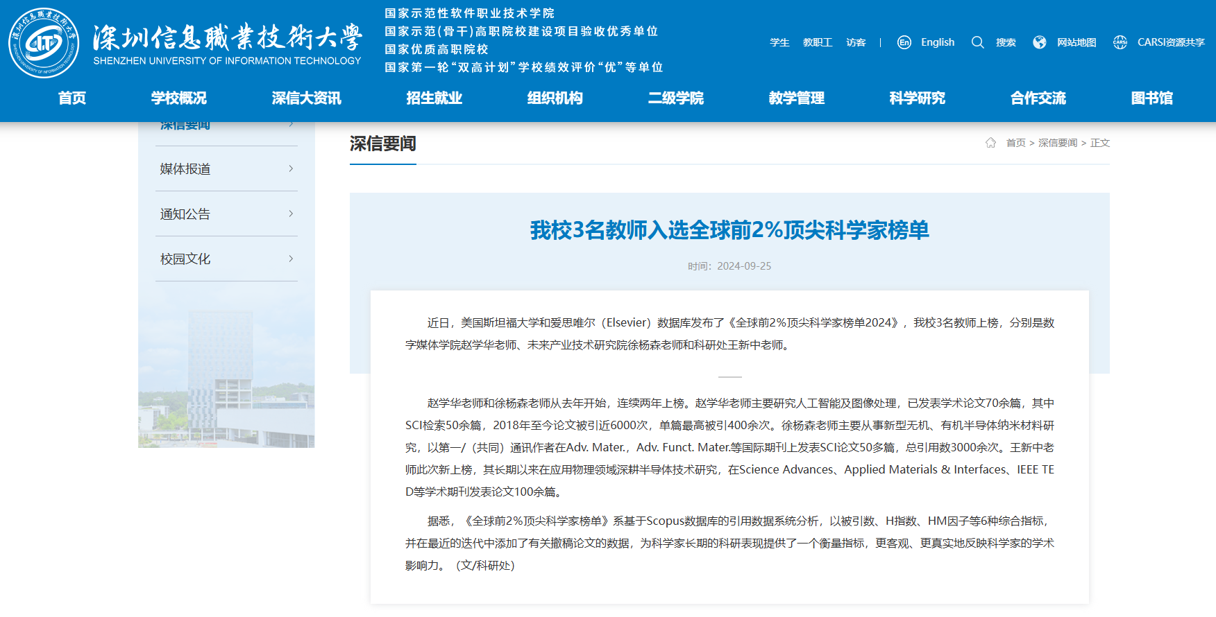 事实上,2025全球2%顶尖科学家榜单,并不是高职院校学者首次上榜。例如,今年刚刚升本的深圳信息职业技术大学,学校教师王新中入选2024年度全球前2%顶尖科学家榜单,赵学华、徐杨森2位教师连续入选2023年、2024年及2025年该榜单。