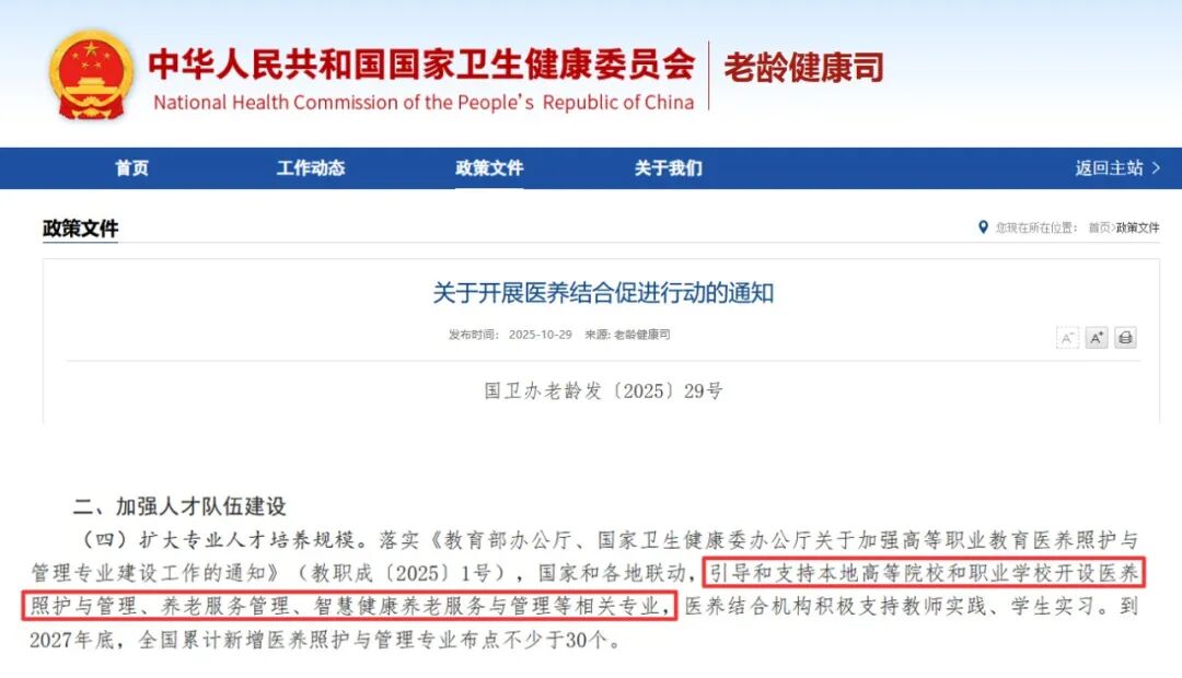 近日,国家卫生健康委办公厅、民政部办公厅、国家医保局办公室、国家中医药局综合司、国家疾控局综合司联合印发《关于开展医养结合促进行动的通知》,明确国家和各地联动,引导和支持本地高等院校和职业学校开设医养照护与管理、养老服务管理、智慧健康养老服务与管理等相关专业。其中,医养照护与管理专业到2027年底,全国累计布点新增不少于30个。