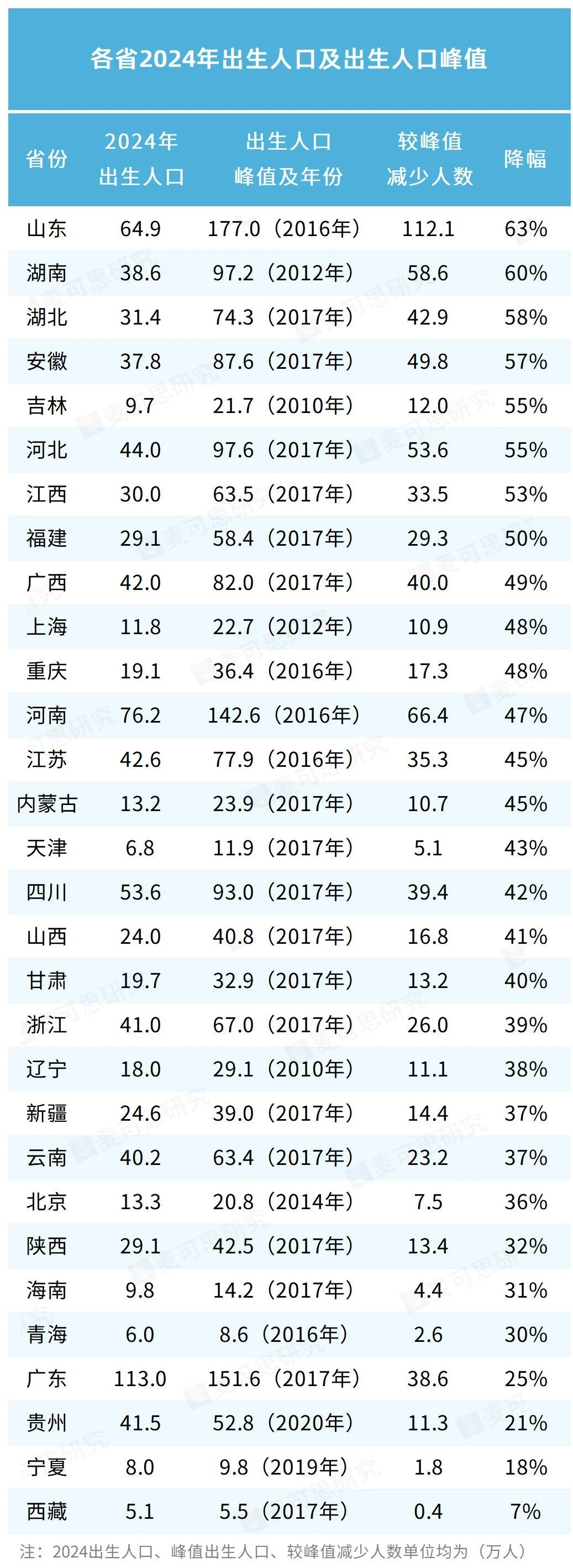 数据显示,山东是出生人口峰值最高的省份,同时也是出生人口降幅最大的省份。山东省的出生人口峰值在2016年达到峰值,当年全省出生人口达到177万,位居全国第一。2024年山东出生人口已降至64.9万,较峰值减少112.1万,降幅达63%。