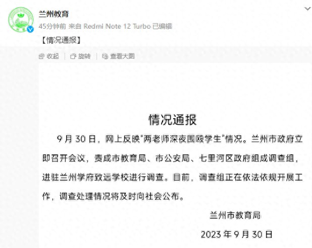 最新的消息是,针对网上反映“两老师深夜围殴学生”情况,兰州市政府立即召开会议,责成市教育局、市公安局、七里河区政府组成调查组进驻兰州学府致远学校进行调查。目前,调查组正在依法依规开展工作,调查处理情况将及时向社会公布。