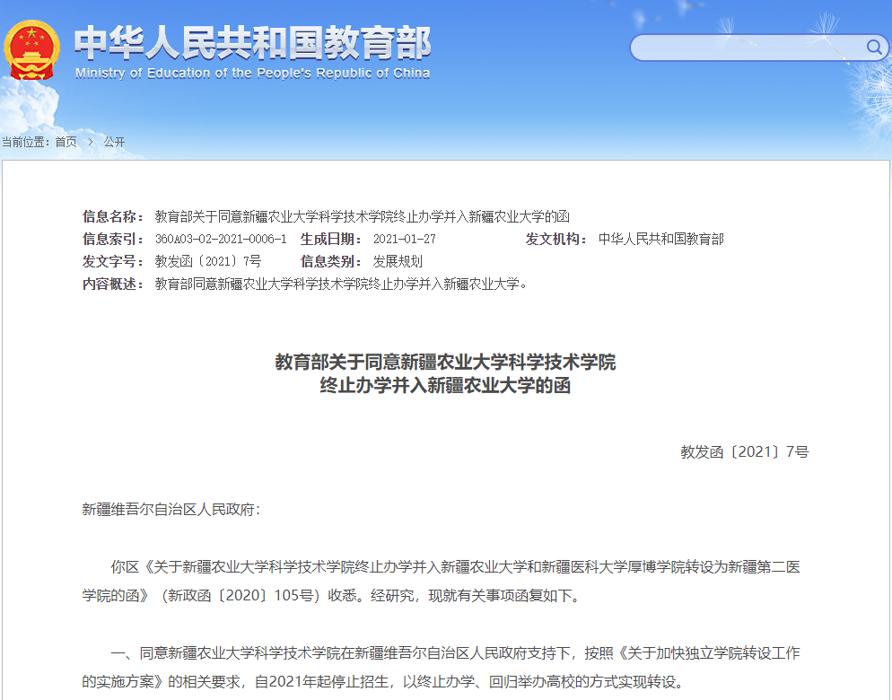 此外,同意新疆农业大学科学技术学院、河北大学工商学院2所独立学院以终止办学方式实现转设。其中,新疆农业大学科学技术学院将并入新疆农业大学,河北大学工商学院回归举办高校(河北大学)。
