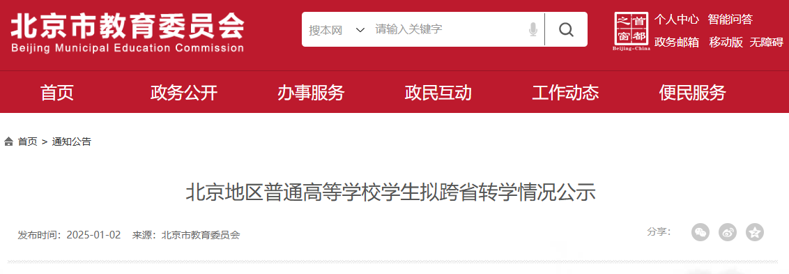 1月2日,北京市教委网站发布了北京地区普通高等学校学生拟跨省转学情况公示,公示显示7名学生拟跨省转学,其中一学生拟从北京物资学院(本科)转入西藏职业技术学院(高职),一名学生拟从北京交通大学威海校区(211高校)转入兰州财经大学(普通本科)。