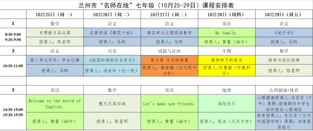 “兰州智慧教育·名师在线”平台为各学校提供七年级至九年级及高一、高二年级的线上教学课程,10月25日-29日具体课程安排如下: