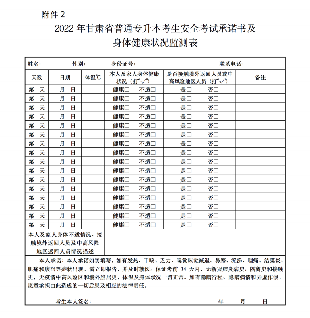 2. 2022年甘肃省普通专升本考生安全考试承诺书及身体健康状况监测表