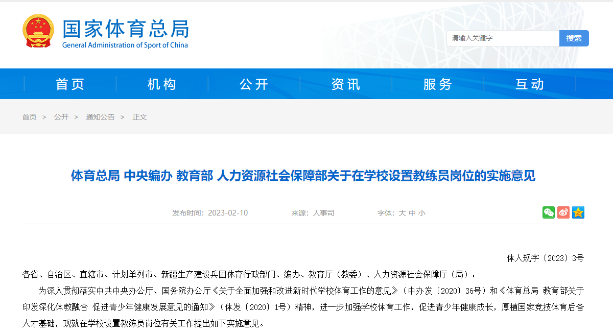 近日,国家体育总局、中央机构编制委员会办公室、教育部、人力资源和社会保障部等四部门联合出台了《关于在学校设置教练员岗位的实施意见》,部署学校教练员岗位设置工作。其中明确——