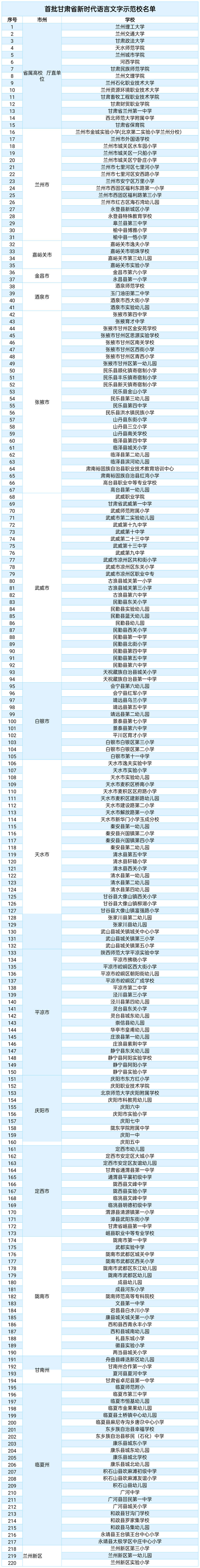 根据《甘肃省教育厅关于开展新时代语言文字示范校创建工作的通知》,在各学校创建、市(州)县(市区)评估、省级评估认定的基础上,经省教育厅常务会议审议,拟命名兰州理工大学等220所学校为首批“甘肃省新时代语言文字示范校”,现予以公示,接受广大群众监督。